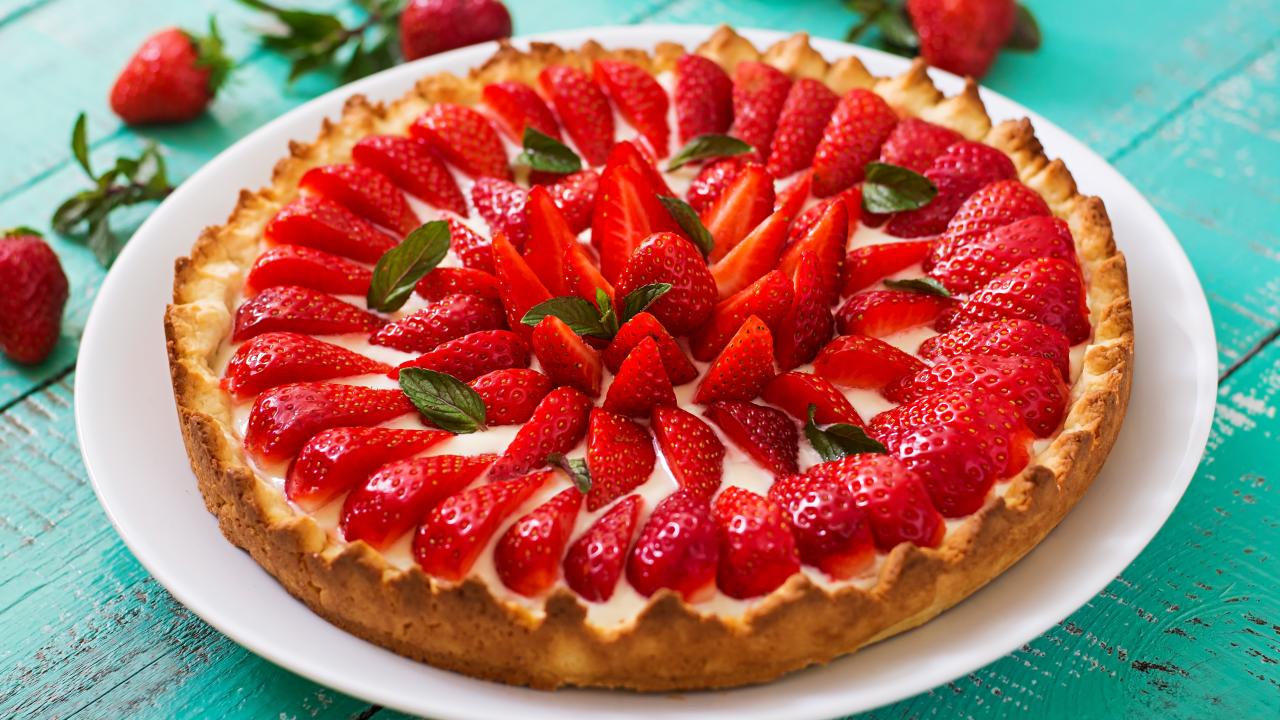 Обои Аппетитный пирог с ягодами клубники на белом блюде