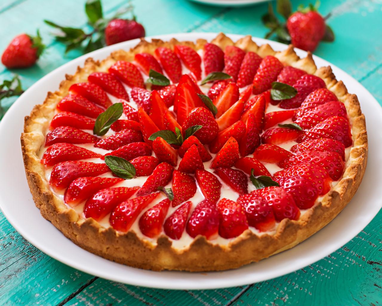 Обои Аппетитный пирог с ягодами клубники на белом блюде