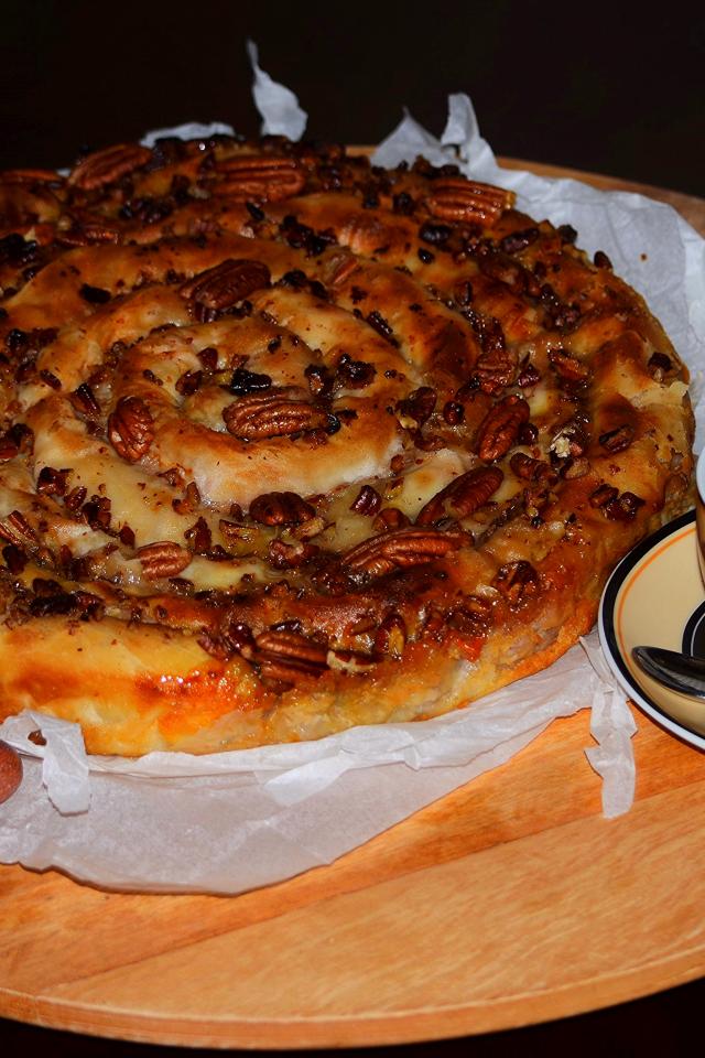 Обои Пирог с орехами на столе с чашкой кофе