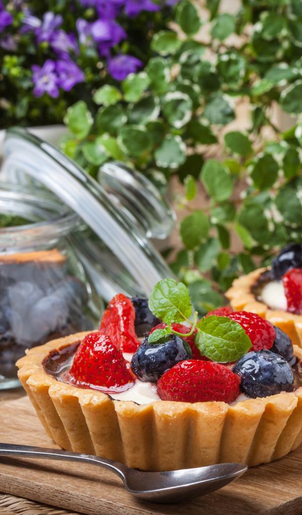 Обои Пирожные с ягодами клубники и черники на столе