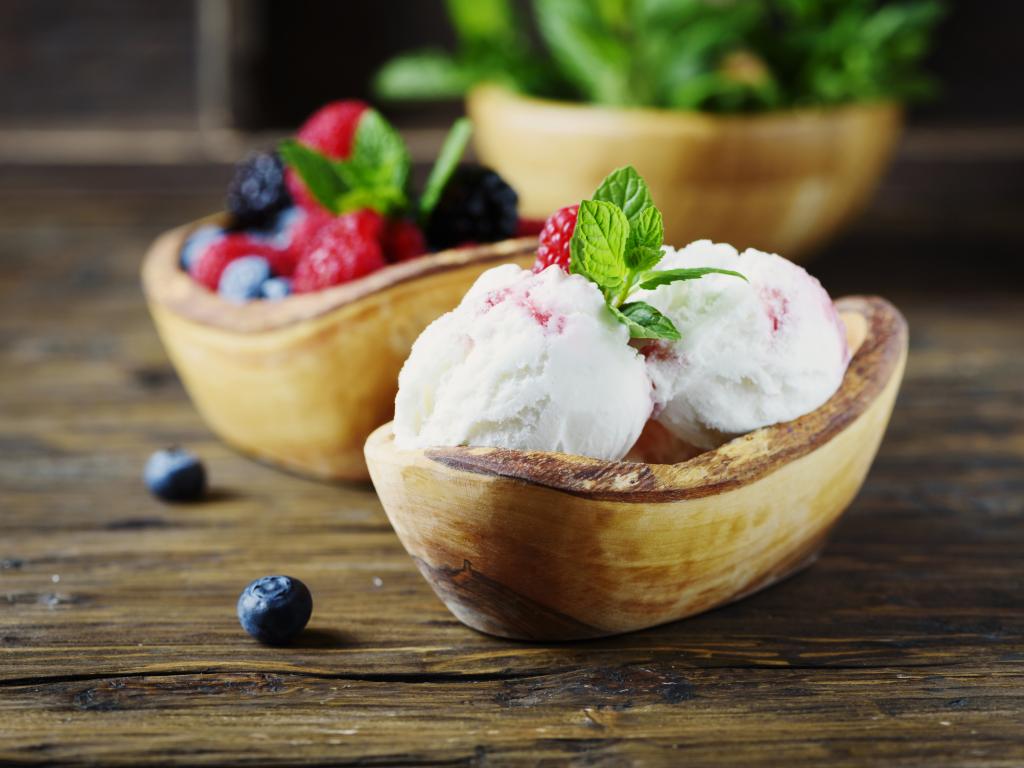 Обои Шарики мороженого с ягодами в деревянной посуде