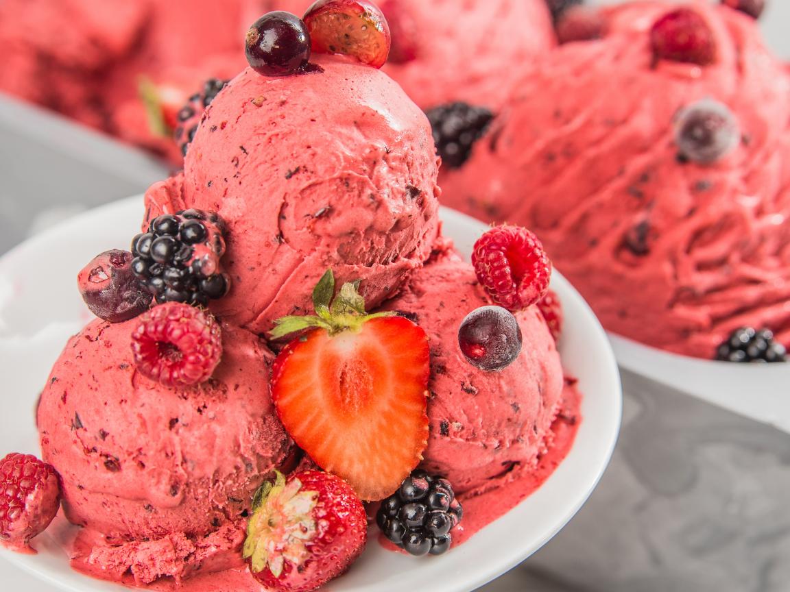 Обои Шарики фруктового мороженого на тарелке с ягодами