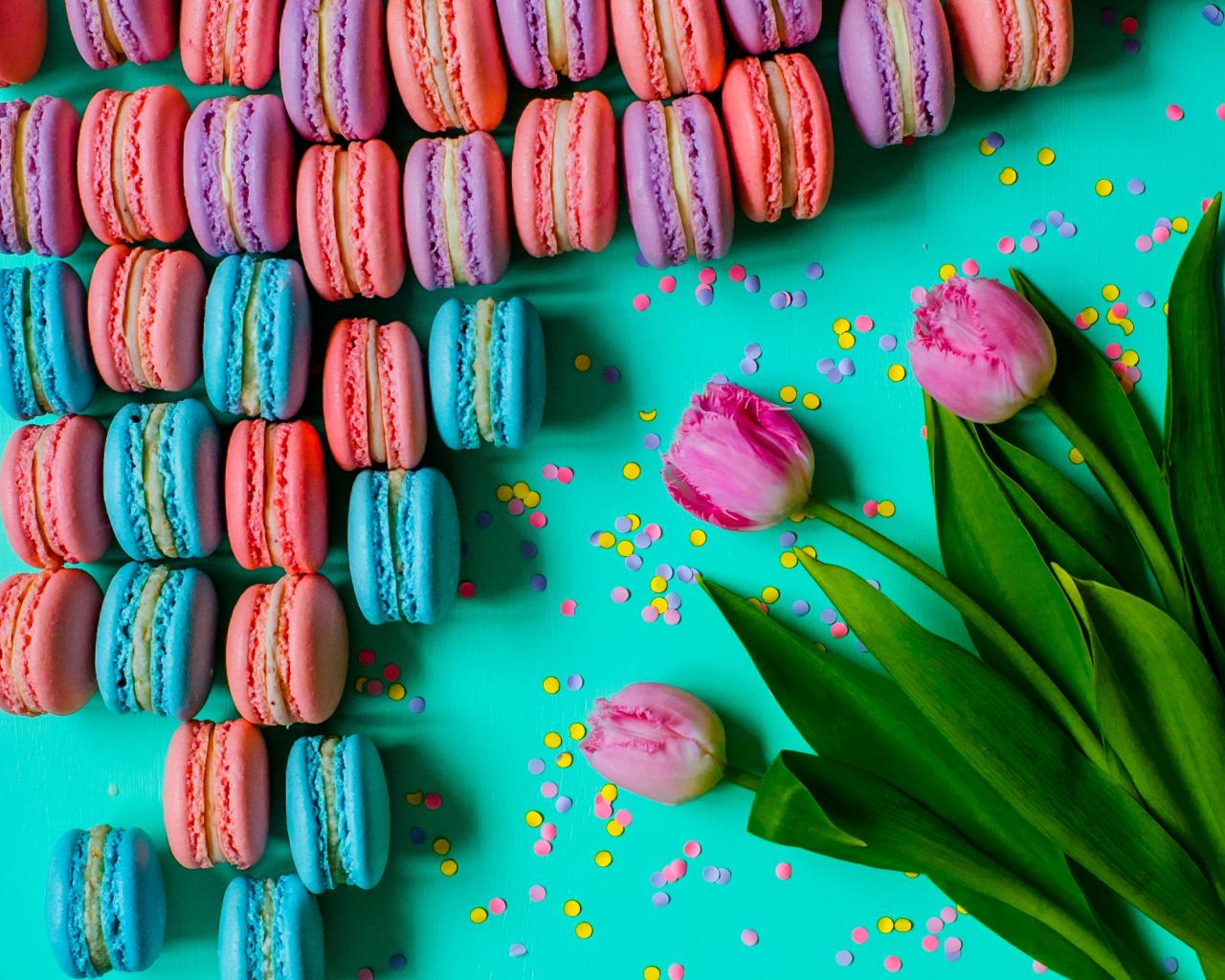 Обои Разноцветные десерты макарун на столе с тюльпанами