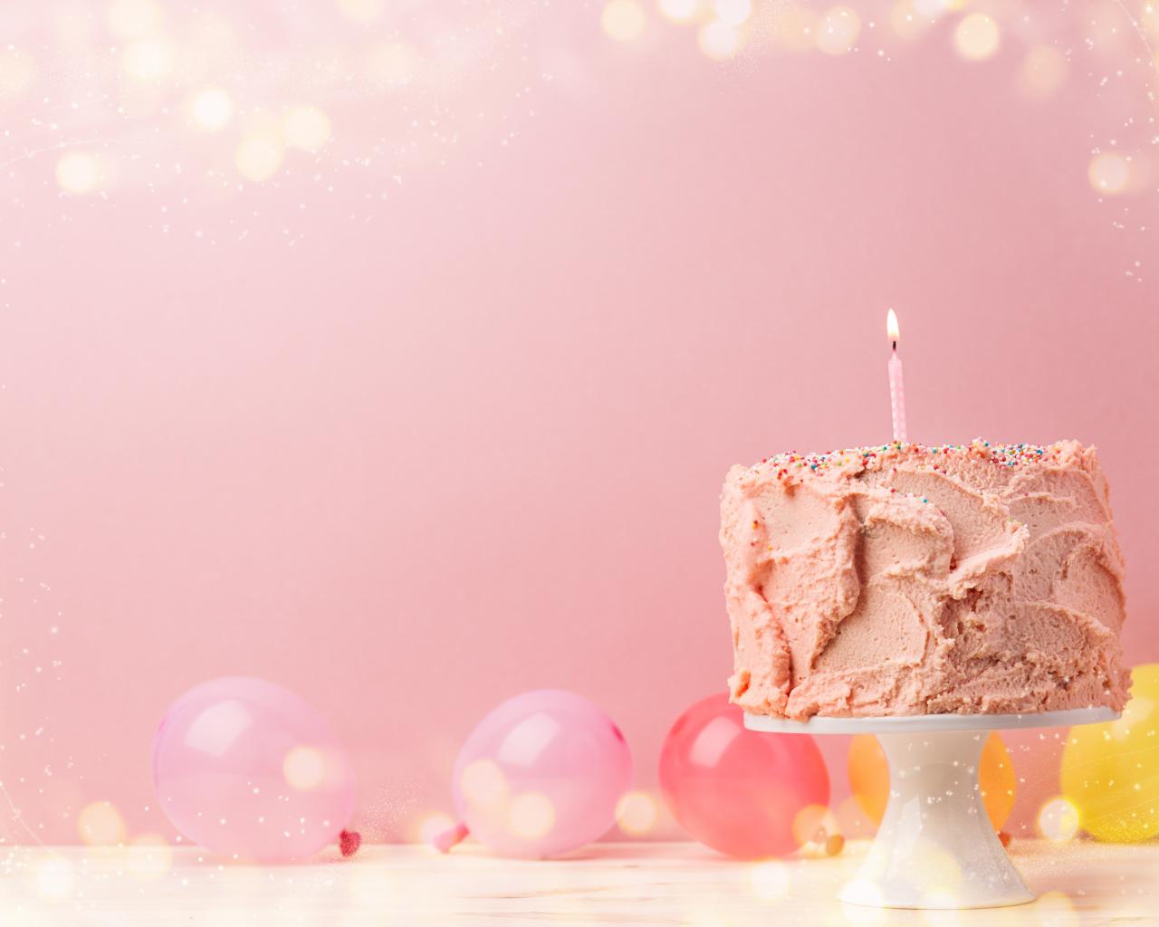 Обои Праздничный торт с воздушными шарами на розовом фоне