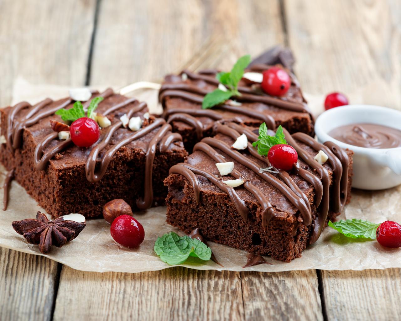 Обои Кусочки шоколадного пирожного с ягодами