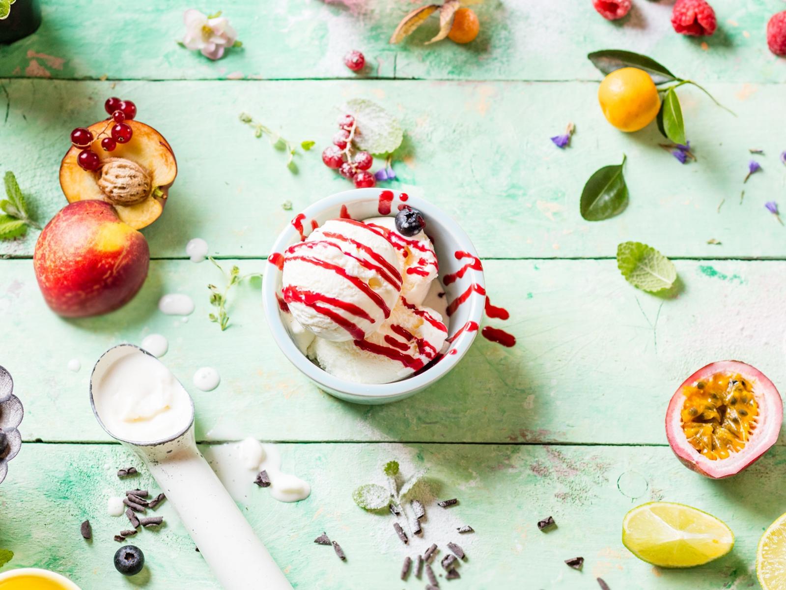 Обои Шарики сливочного мороженого с ягодами и фруктами