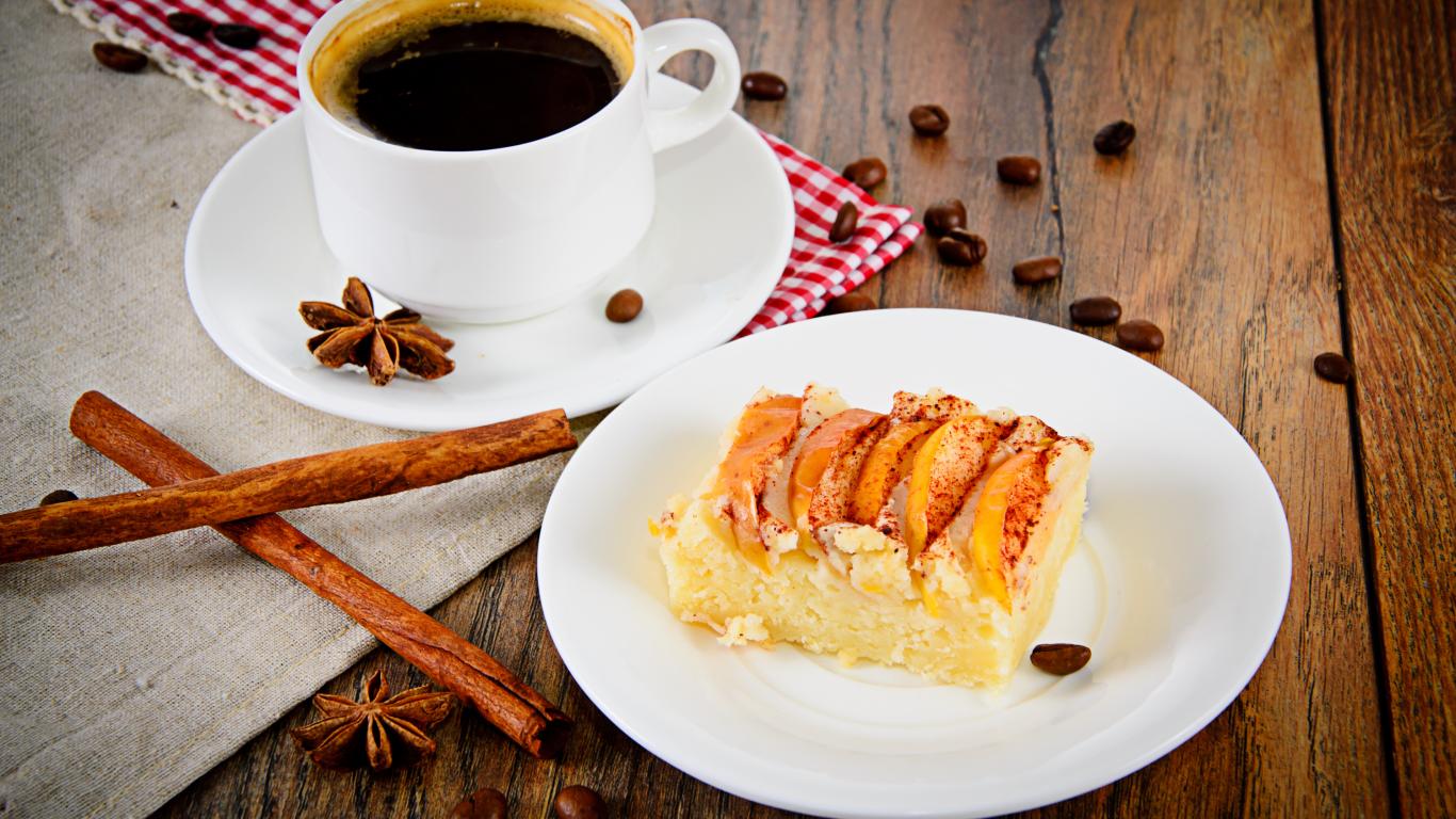 Обои Чашка кофе на столе с кусочком пирога