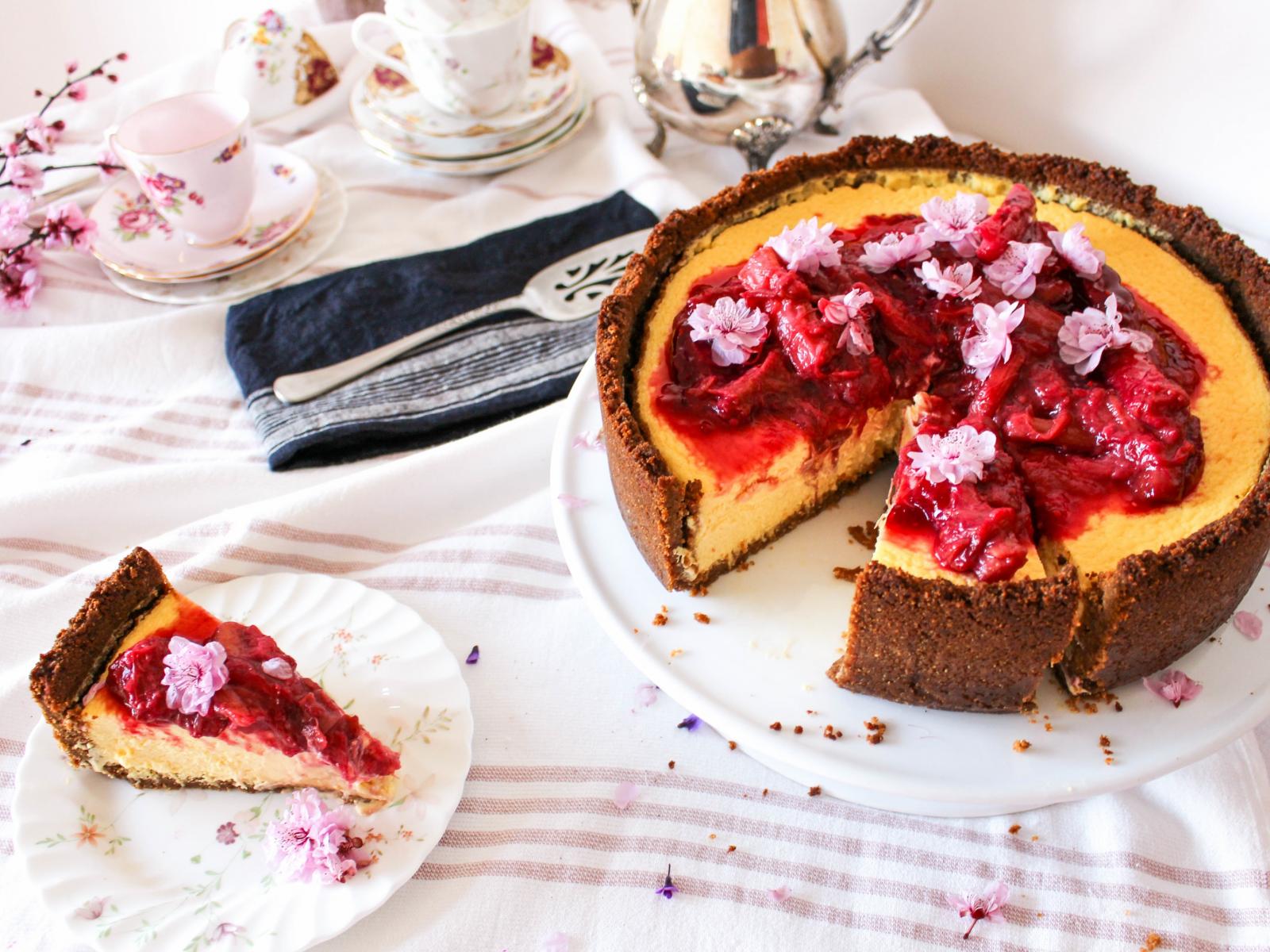 Обои Чизкейк с вишневым вареньем и листьями мяты
