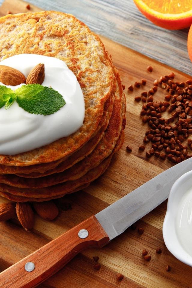 Обои Гречневые оладьи со сметаной на разделочной доске