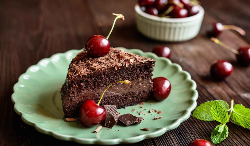 Обои Кусок пирожного с черешнями на тарелке