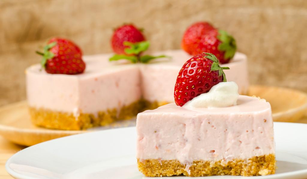 Обои Кусок торта с клубникой на белой тарелке
