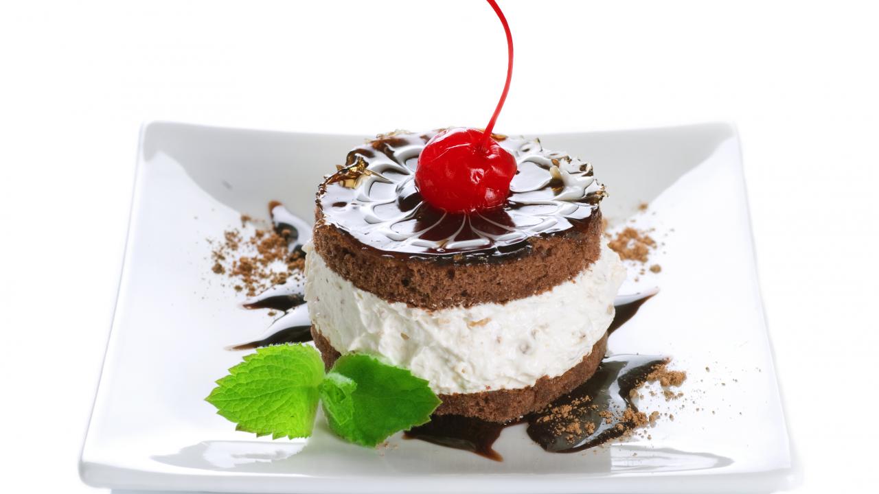 » Обои Аппетитное пирожное с вишней на белом фоне