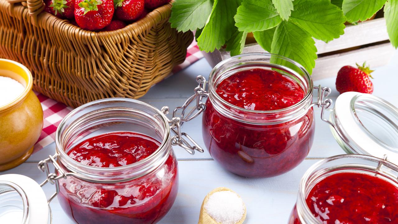 Обои Клубничное варенье в стеклянных баночках на столе ягодами