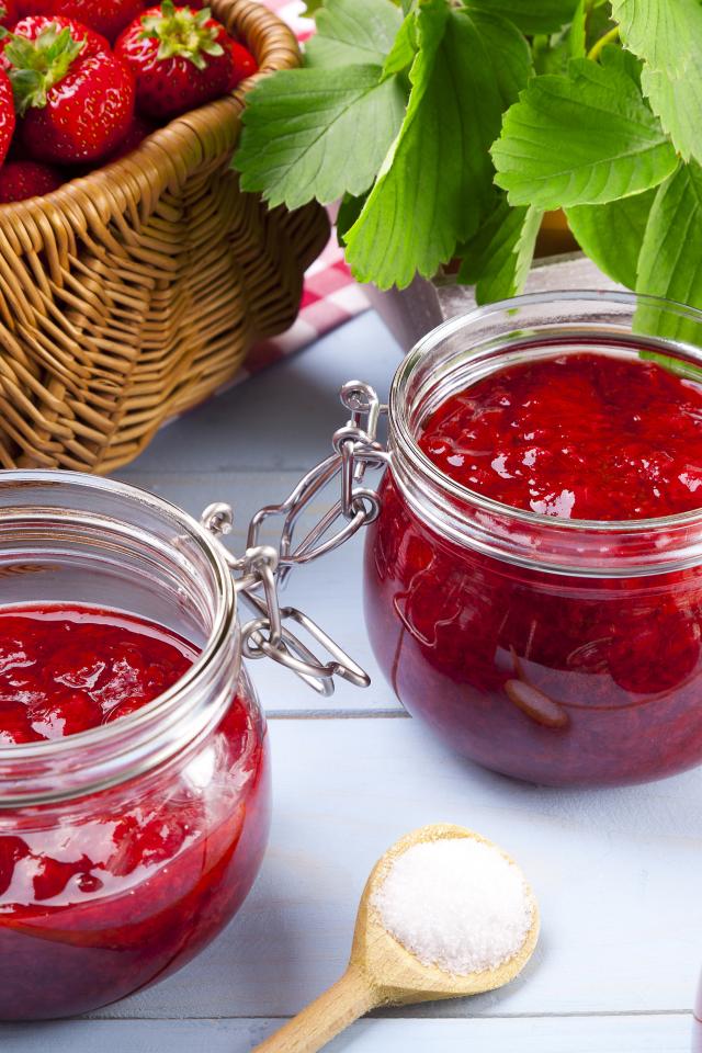 Обои Клубничное варенье в стеклянных баночках на столе ягодами