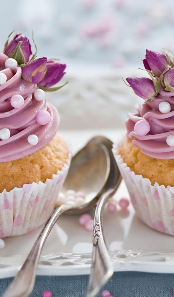 Обои Два вкусных капкейка с кремом на тарелке