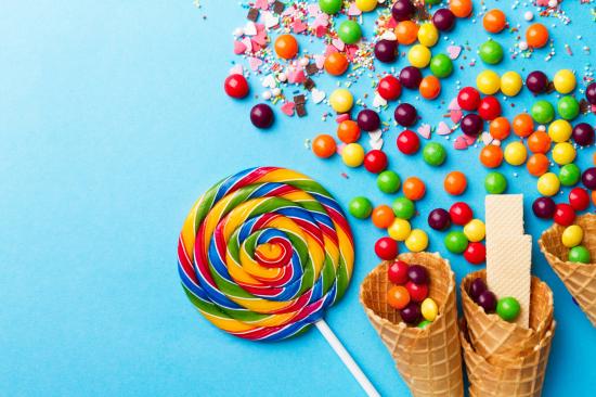 Обои Сладкие конфеты и вафельные рожки на голубом фоне
