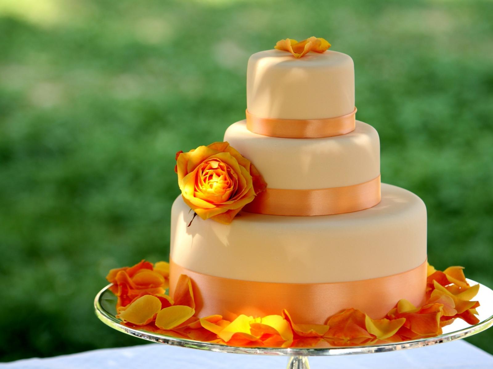 Обои Красивый оранжевый свадебный торт с лепестками розы