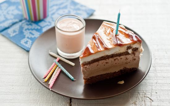 Обои Кусок праздничного торта со свечкой на тарелке