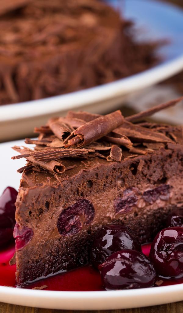 Обои Шоколадный пирог с вишневым вареньем на белой тарелке