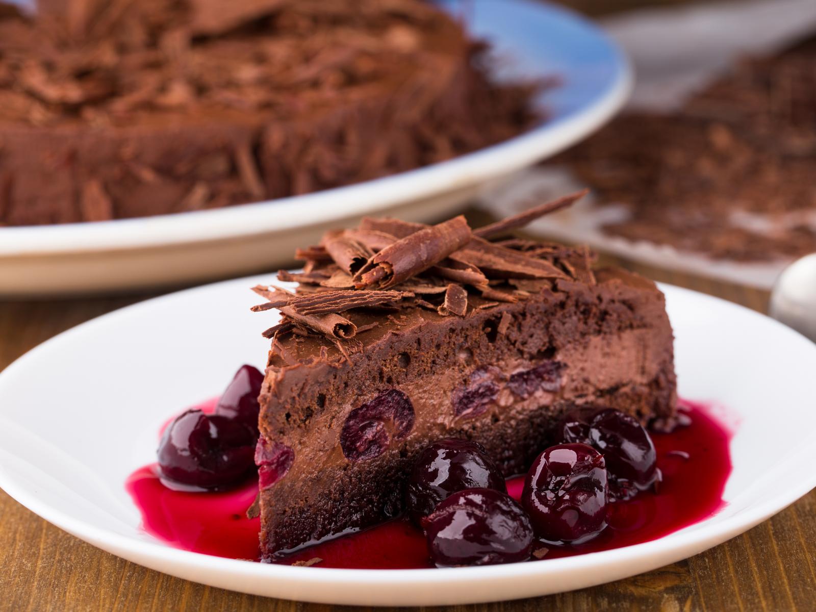 Обои Шоколадный пирог с вишневым вареньем на белой тарелке