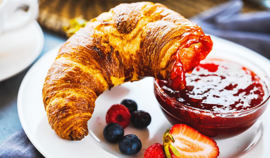 Обои Круассан с джемом и ягодами на тарелке