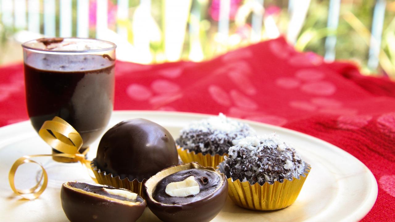 Обои Шоколадные круглые конфеты на белой тарелке