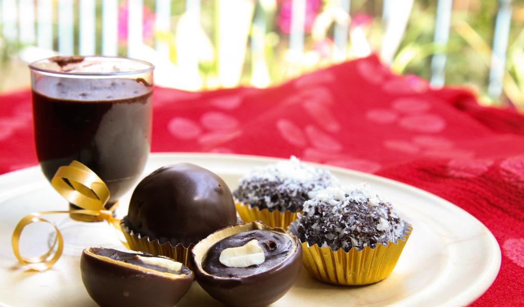 Обои Шоколадные круглые конфеты на белой тарелке