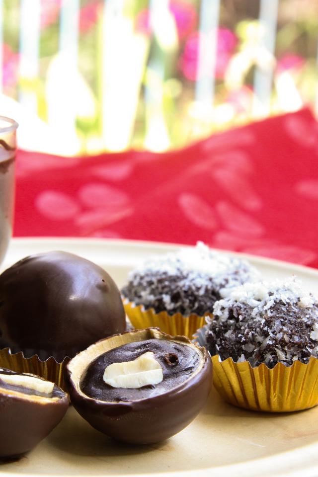 Обои Шоколадные круглые конфеты на белой тарелке