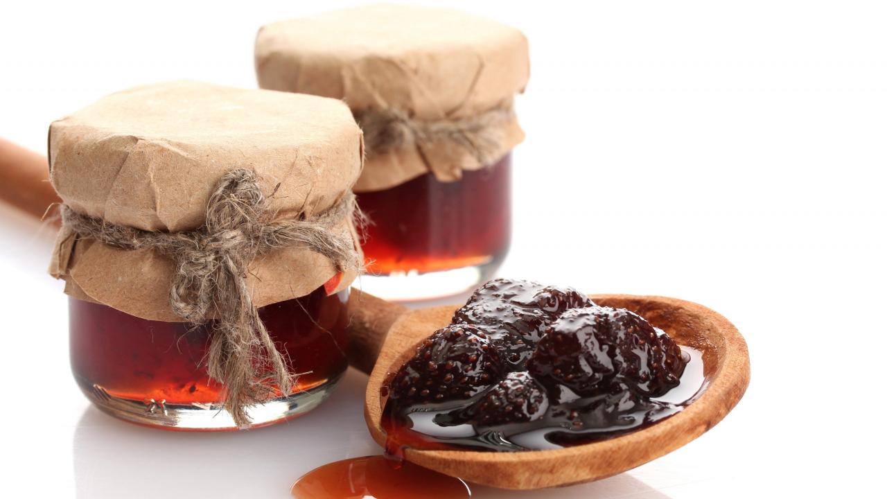 Обои Две банки клубничного варенья на столе с ложкой