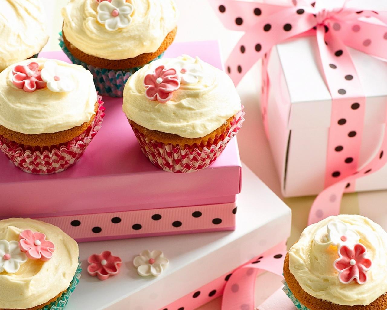 Обои Праздничные кексы с кремом и подарочной коробкой на столе