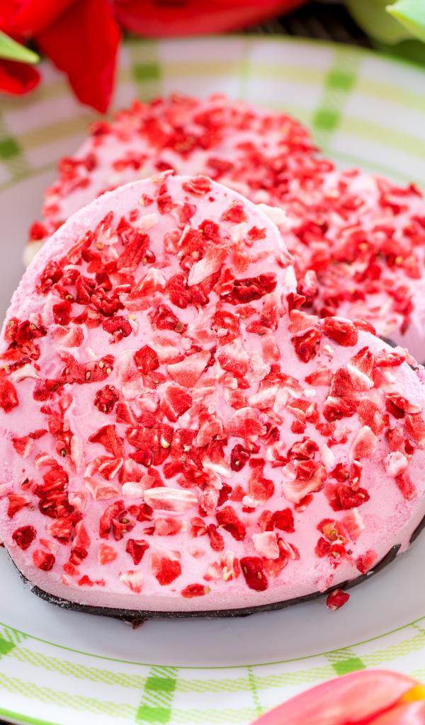 Обои Два печенья в форме сердца на тарелке с тюльпанами