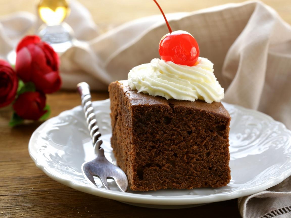 Обои Кусок шоколадного пирога с кремом и вишней