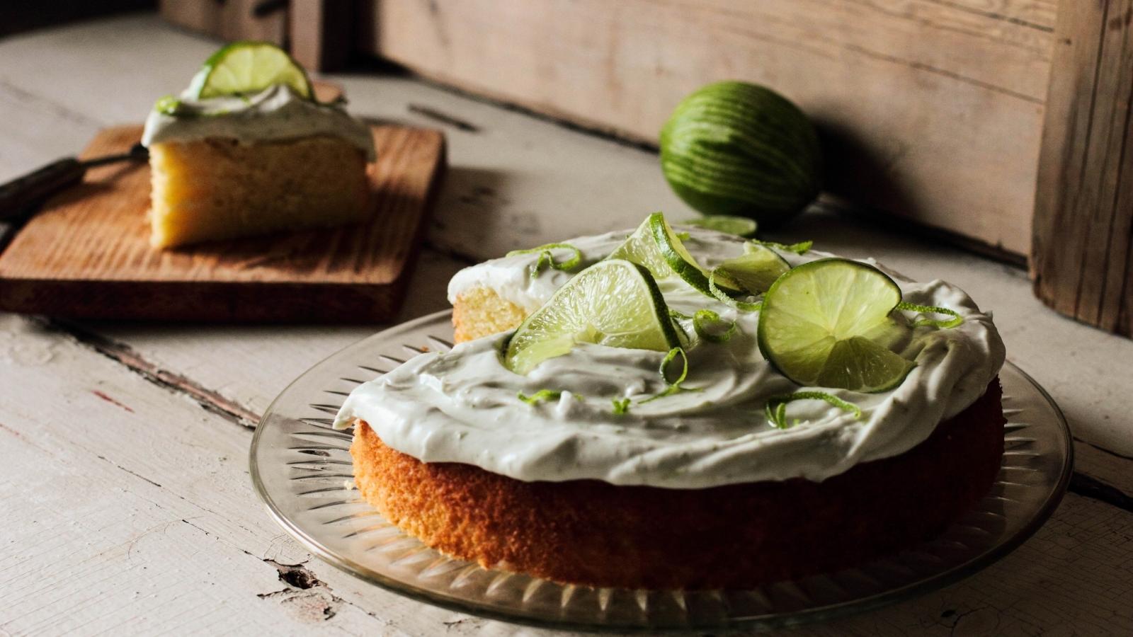 Обои Пирог с кремом и кусочками лайма на столе
