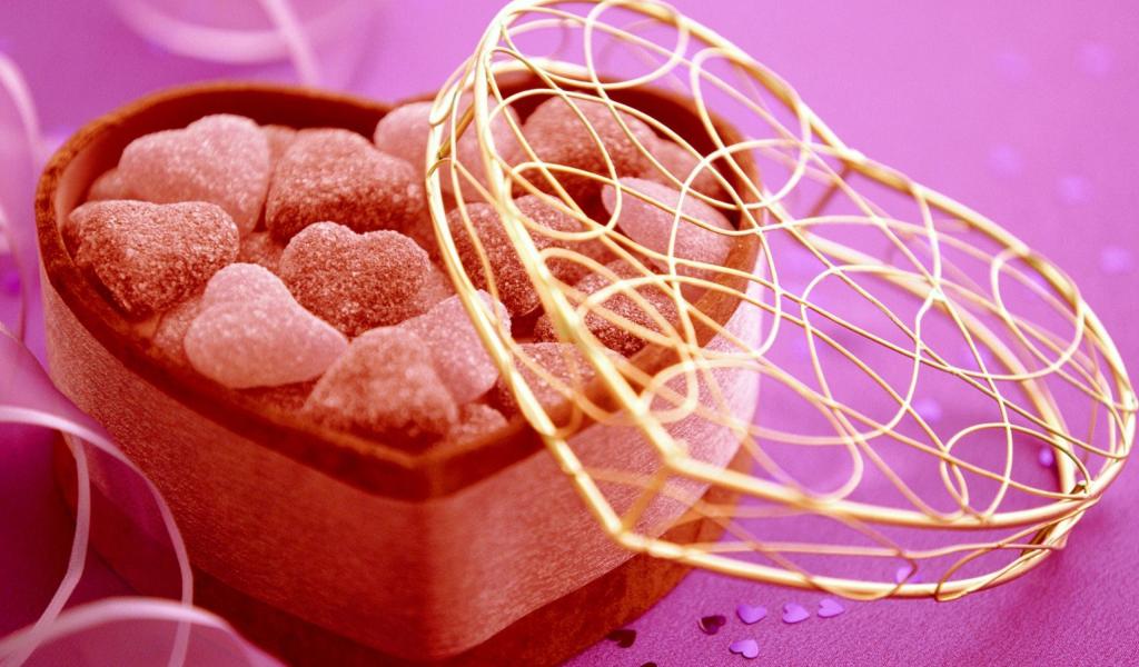 Обои Коробка с мармеладом в форме сердца на розовом фоне