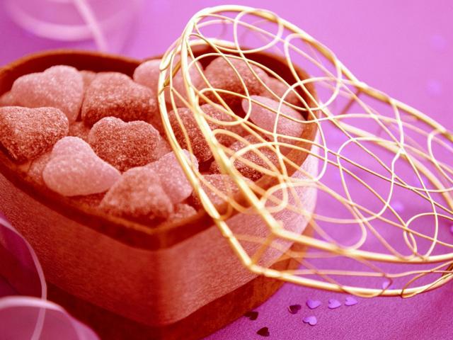 Обои Коробка с мармеладом в форме сердца на розовом фоне