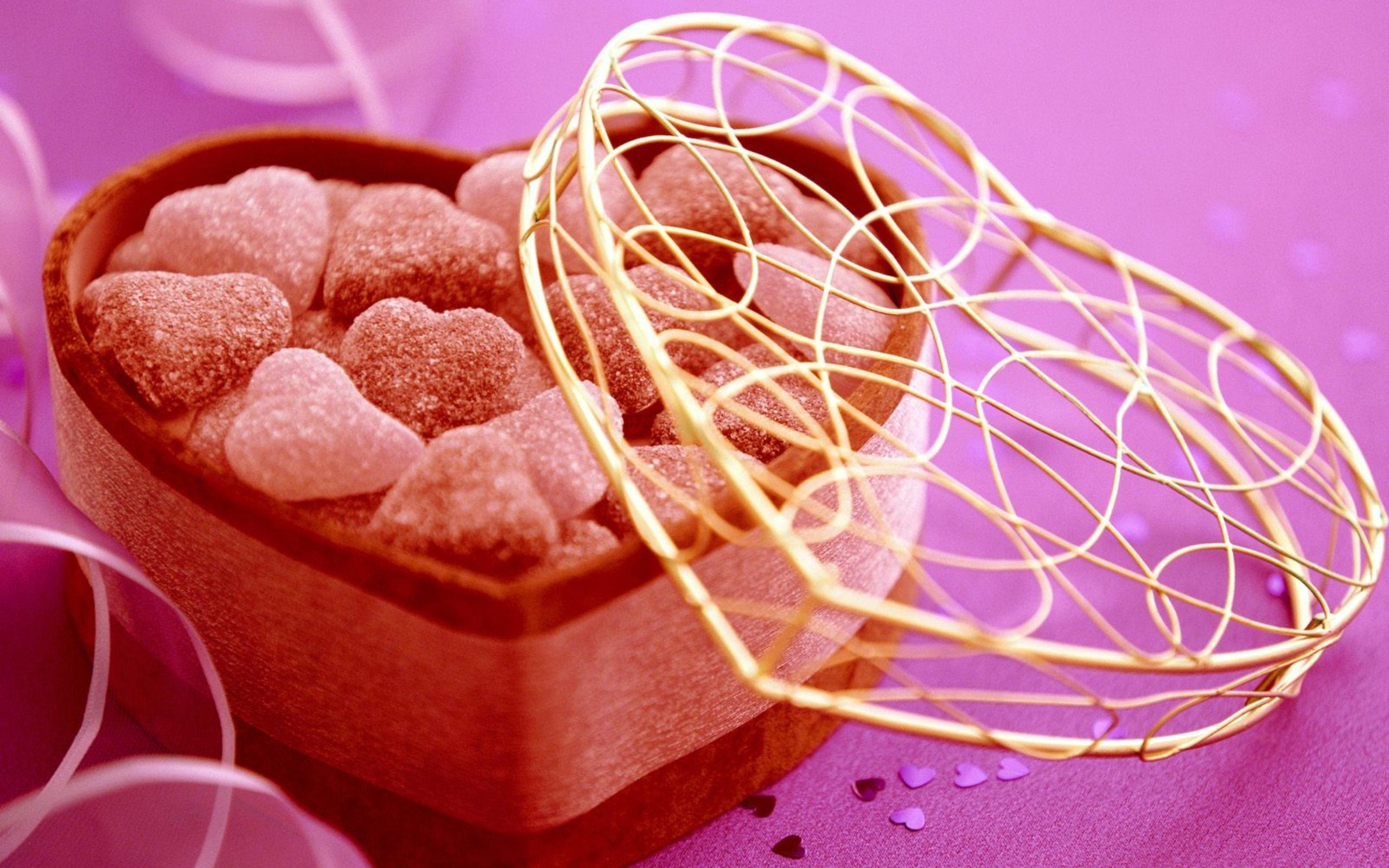 Обои Коробка с мармеладом в форме сердца на розовом фоне