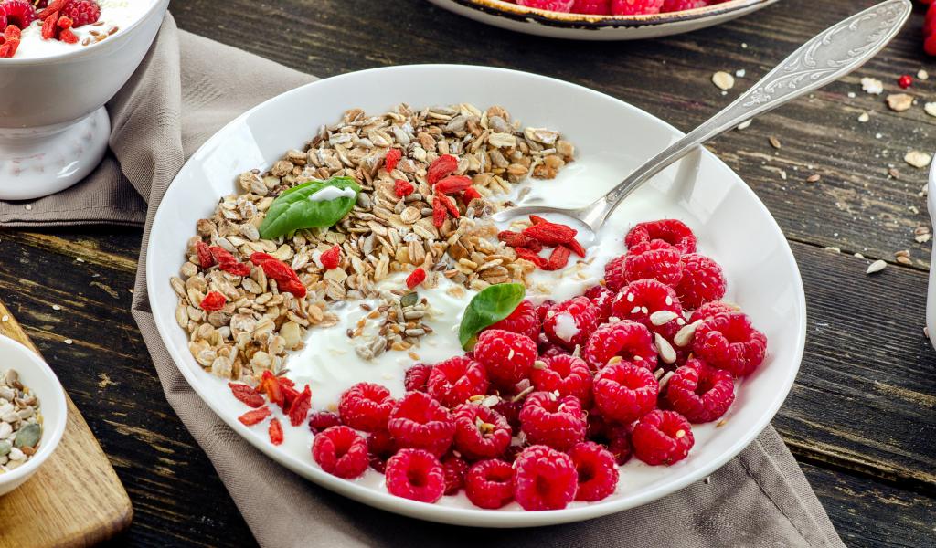 Обои Мюсли йогуртом и свежими ягодами малины на завтрак