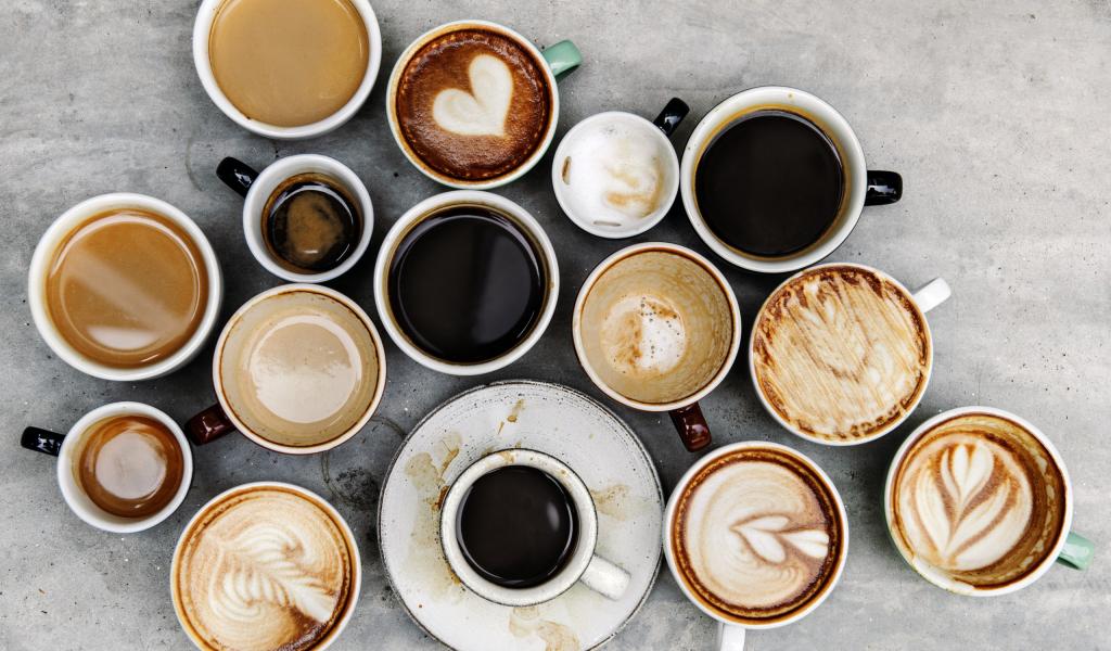 Обои Много чашек с кофе на столе вид сверху