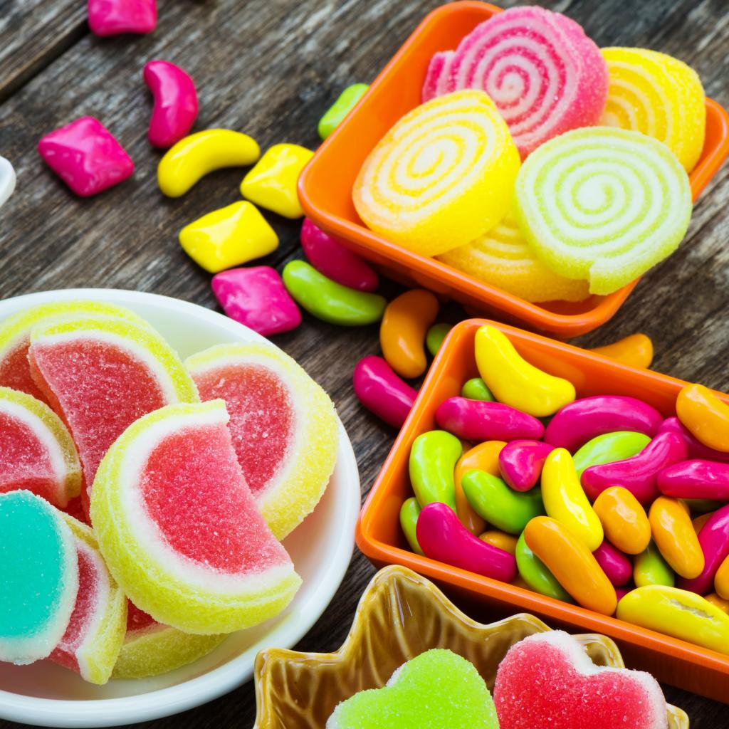 Обои Разноцветный мармелад с конфетами на деревянном столе
