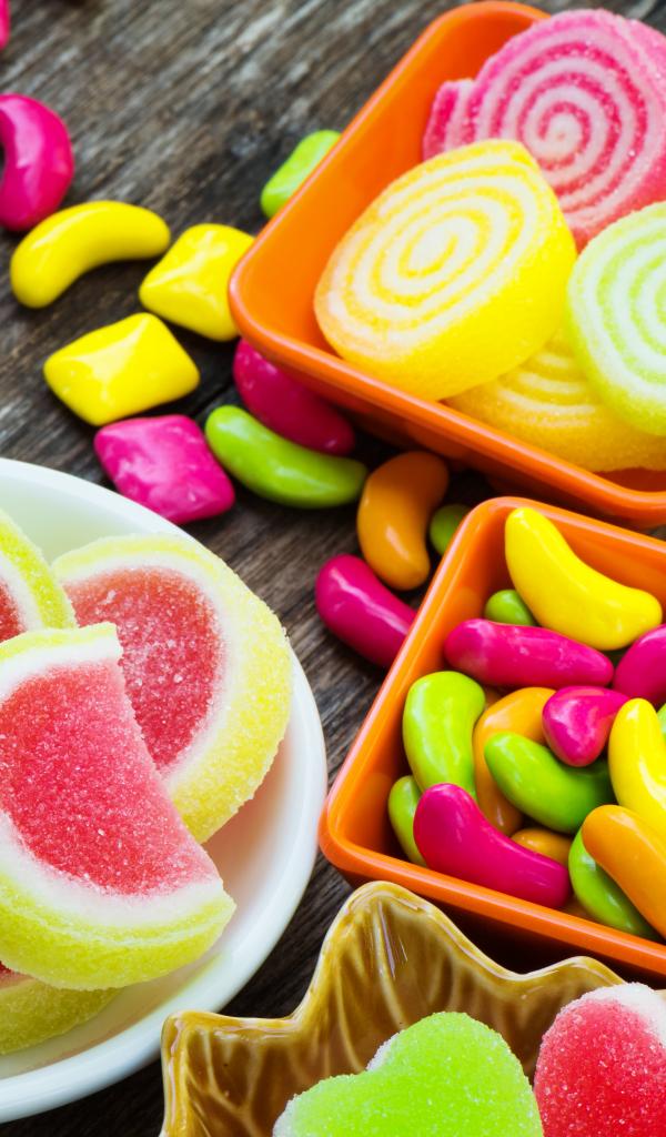 Обои Разноцветный мармелад с конфетами на деревянном столе