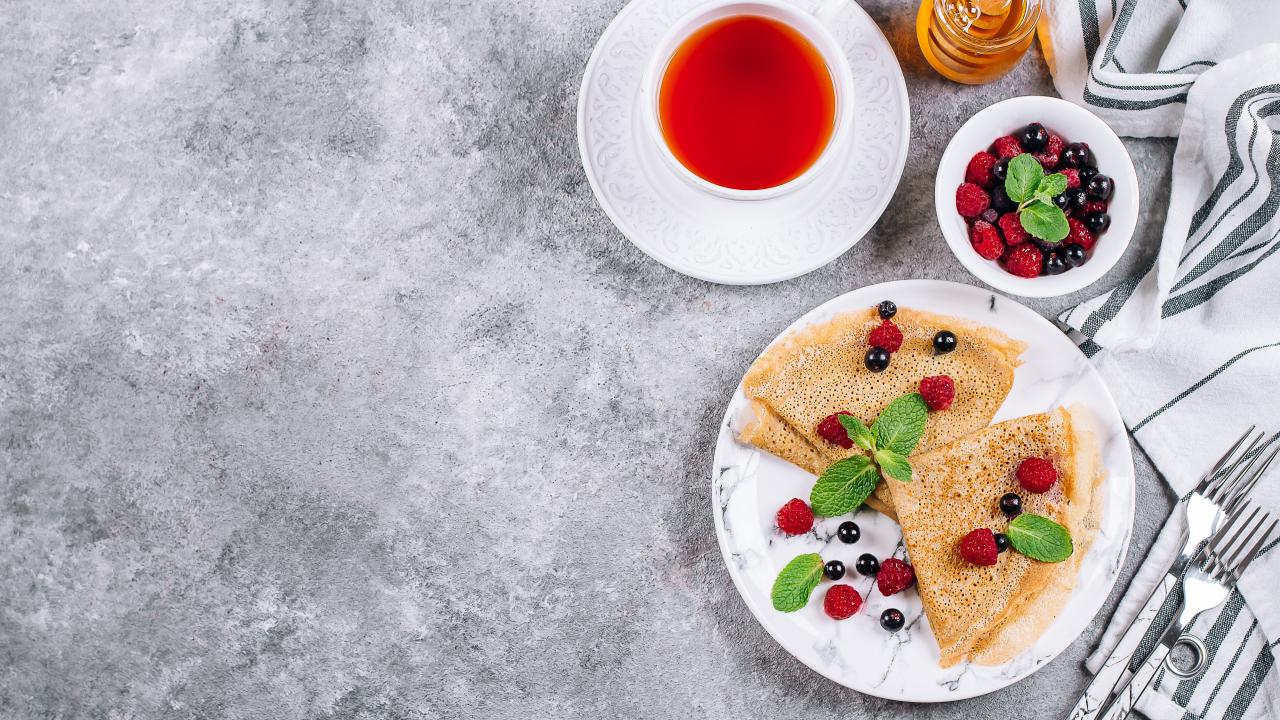 Обои Тонкие блинчики на столе с ягодами, чаем и медом