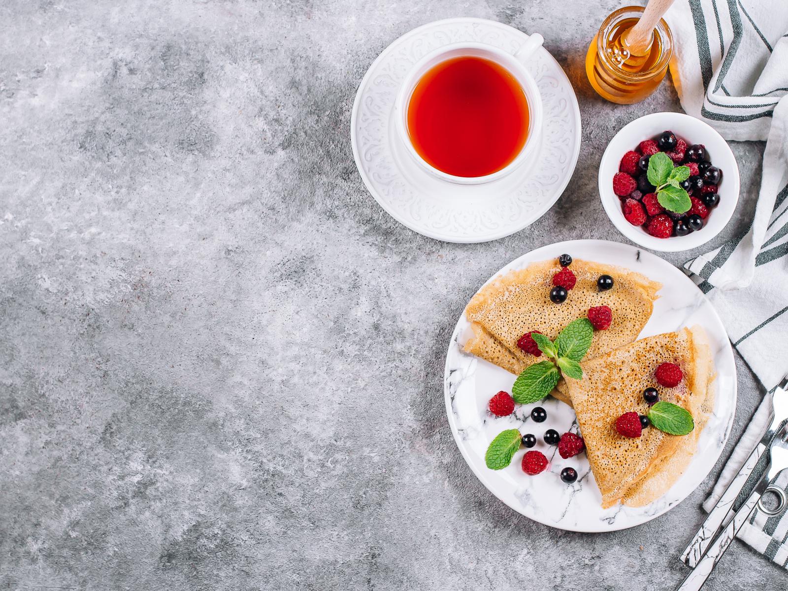 Обои Тонкие блинчики на столе с ягодами, чаем и медом