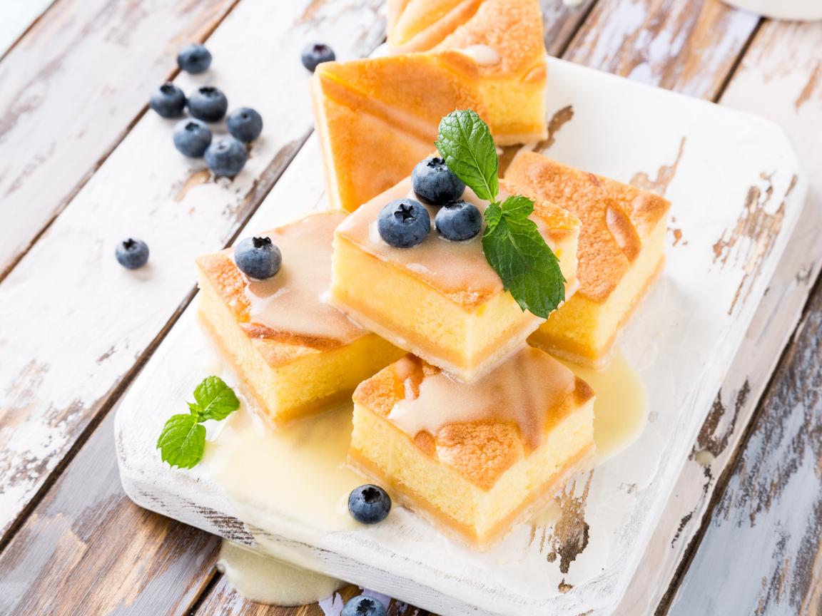 Обои Бисквитные пирожные с сиропом и ягодами черники на столе