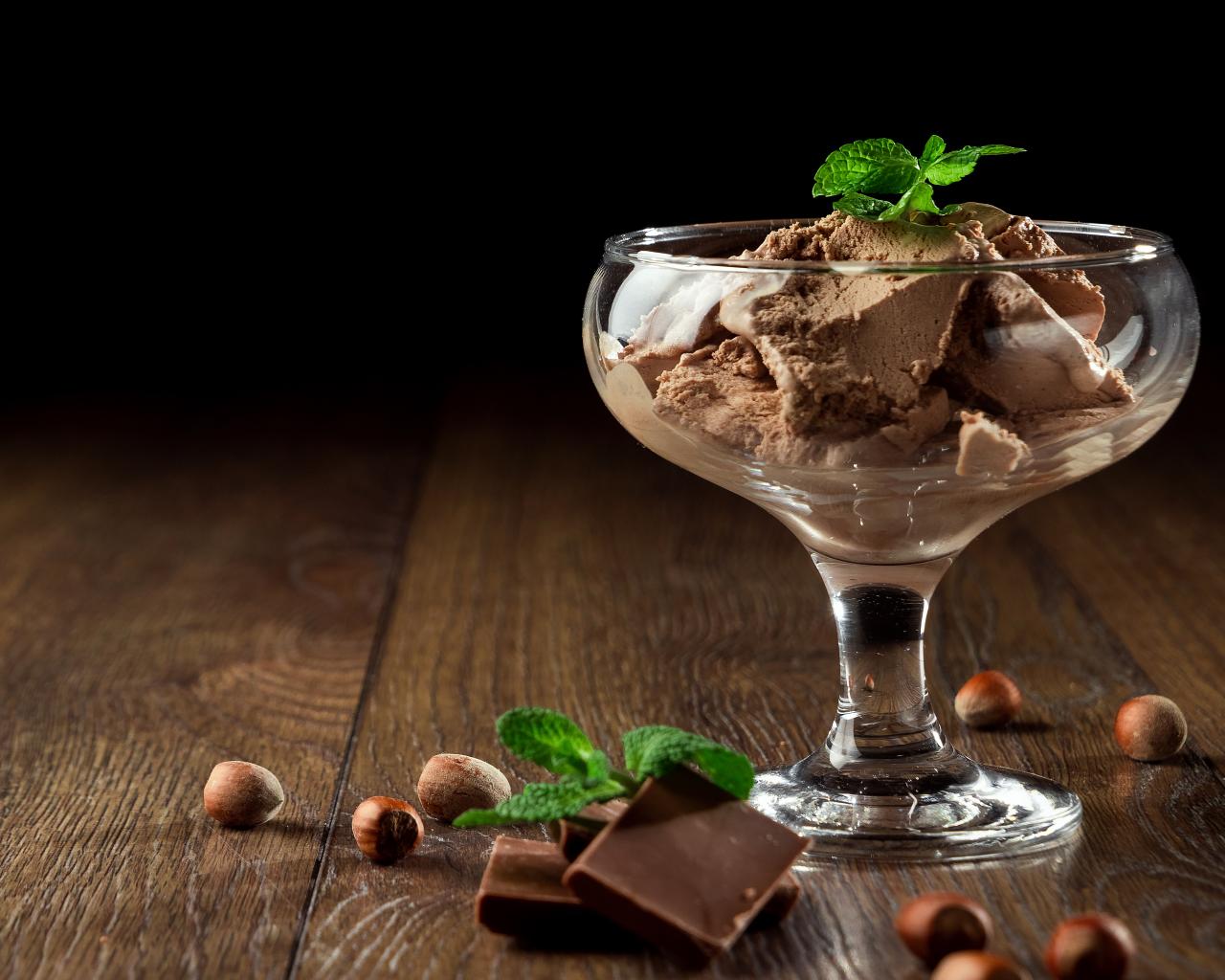 Обои Кофейное мороженое в креманке на столе с шоколадом и орехами
