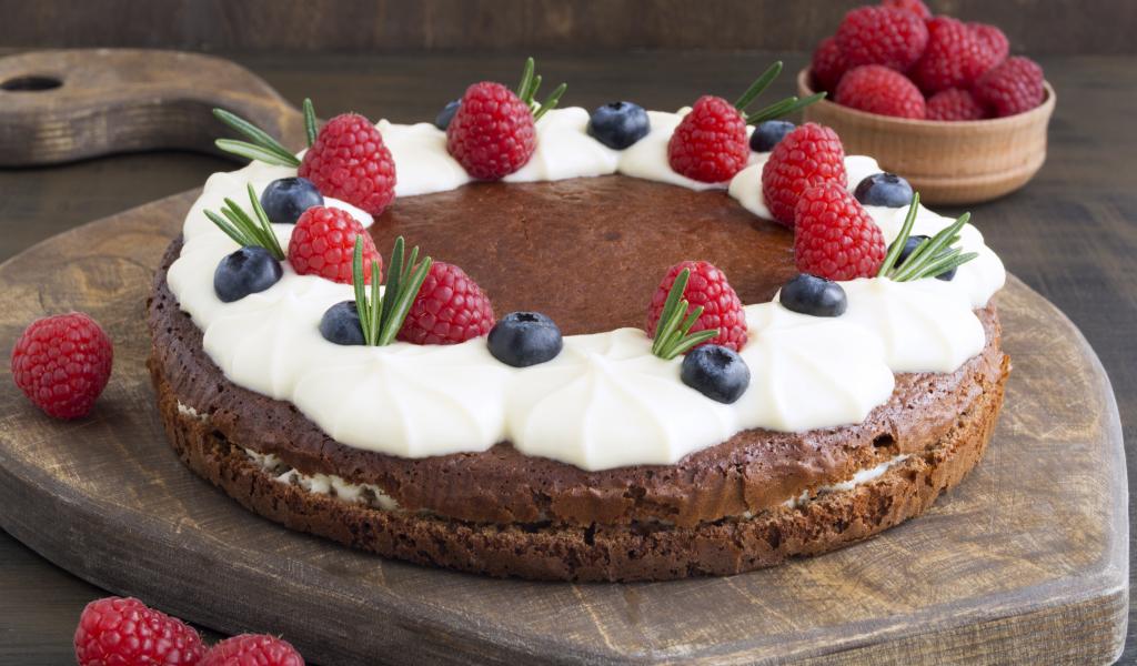 Обои Кофейный торт со сливками и ягодами черники и малины