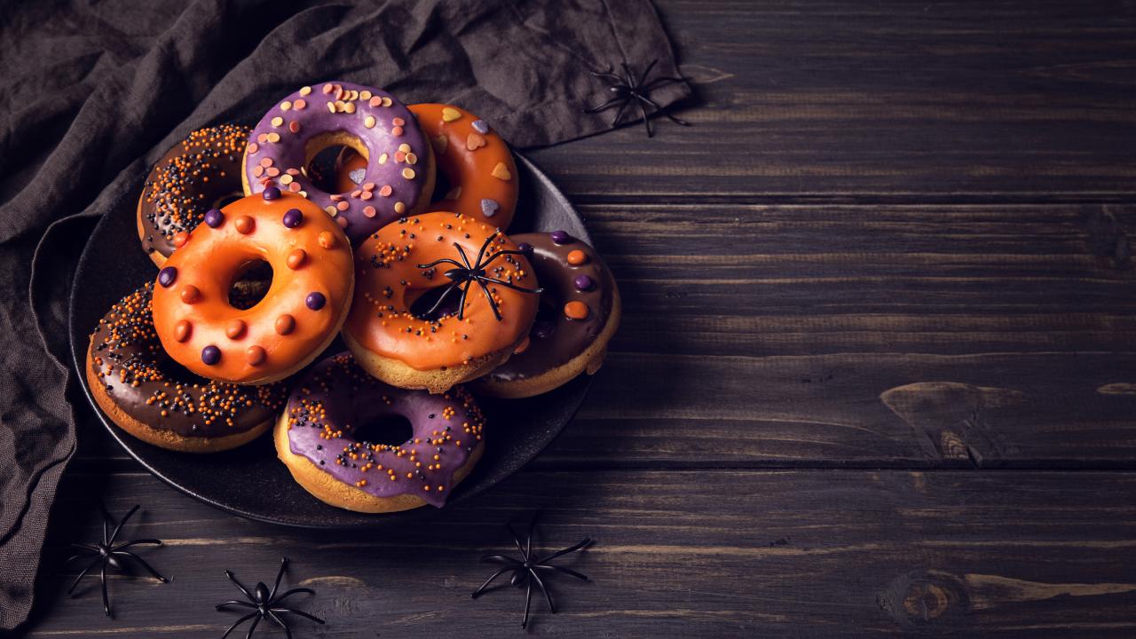Обои Пончики с глазурью на столе угощение на Хэллоуин