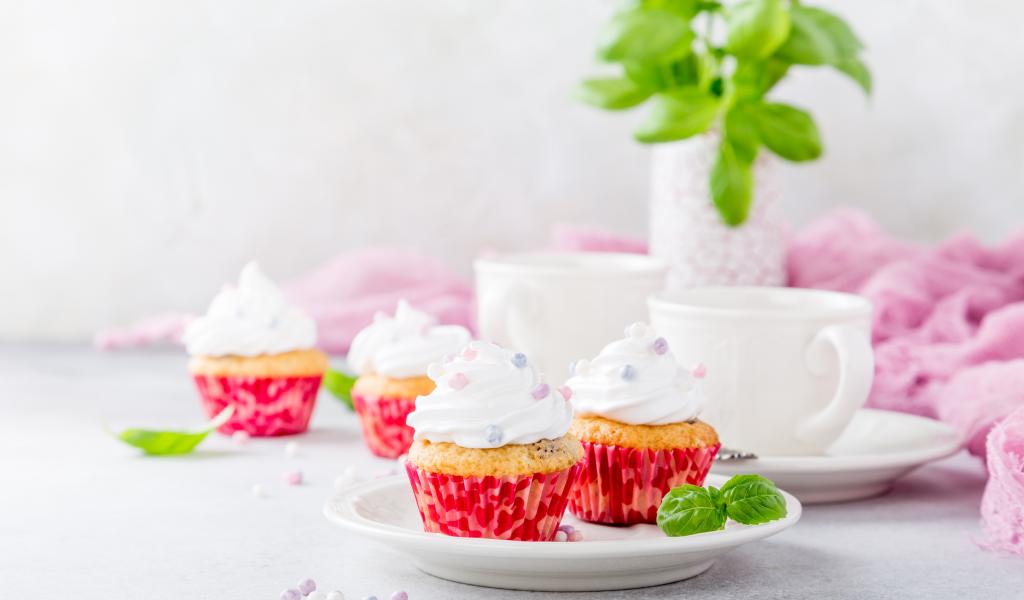 Обои Аппетитные кексы с кремом на столе с чашками