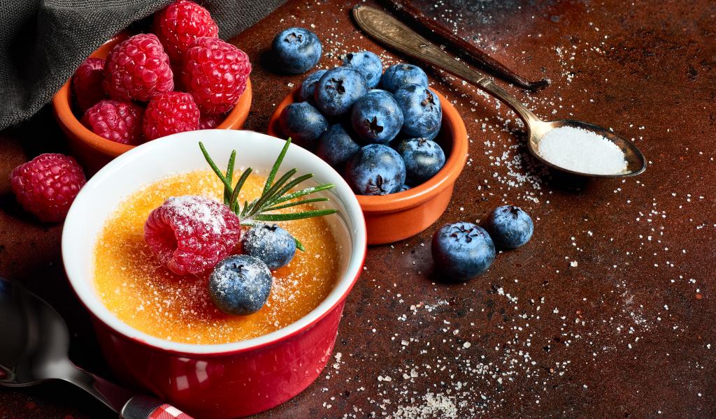 Обои Пудинг на столе с ягодами малины и черники
