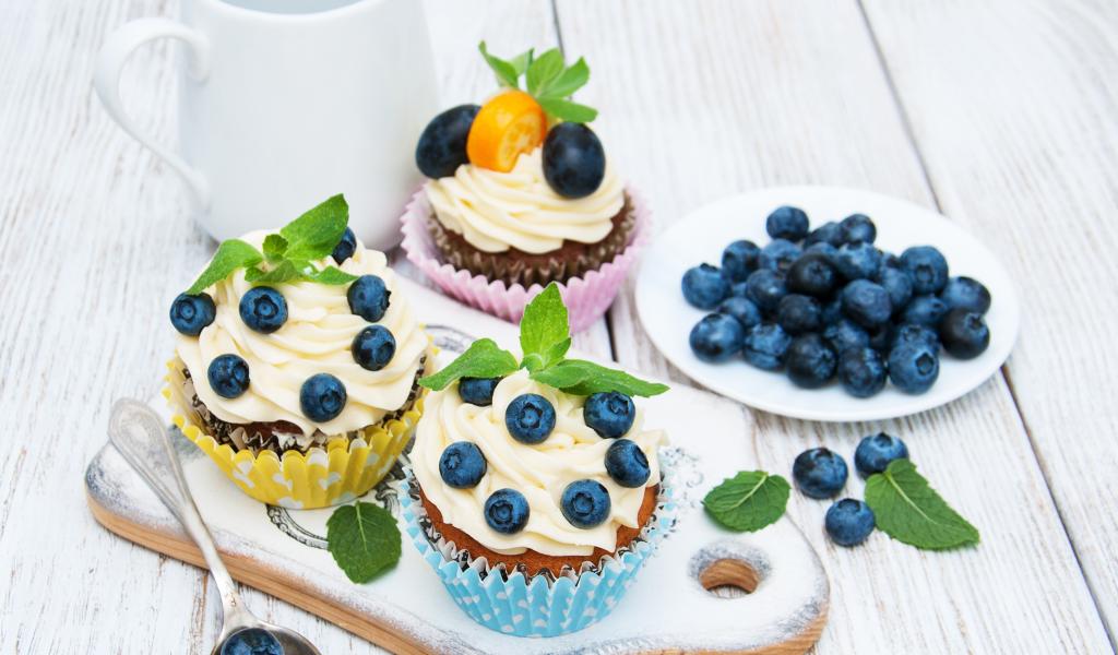 Обои Шоколадные кексы с белым кремом и ягодами черники и малины