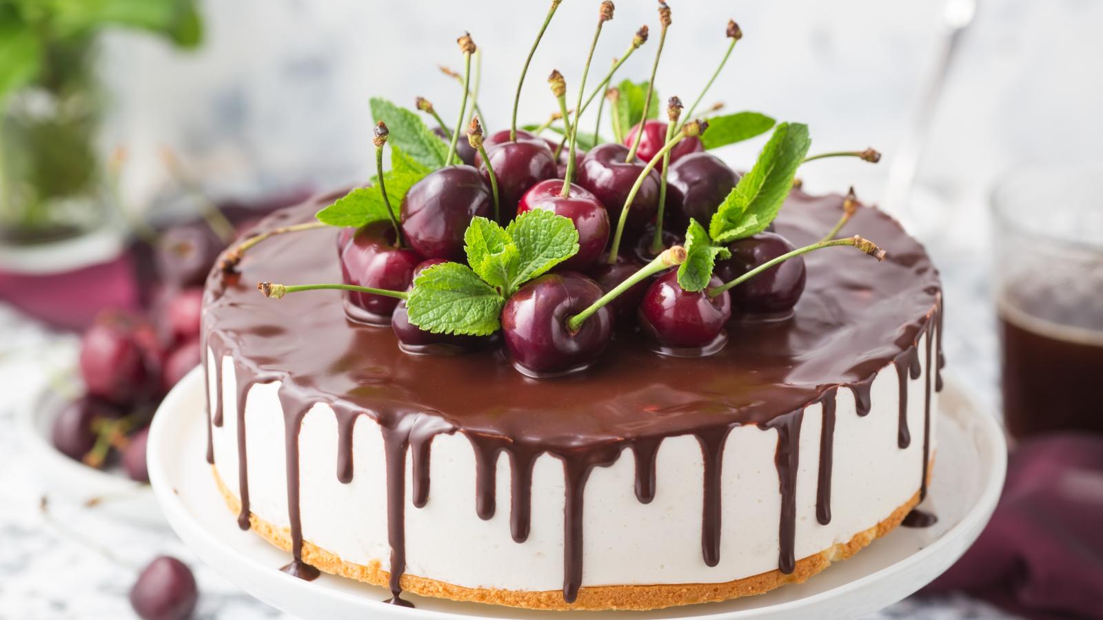Обои Вкусный торт мусс с шоколадом и черешней